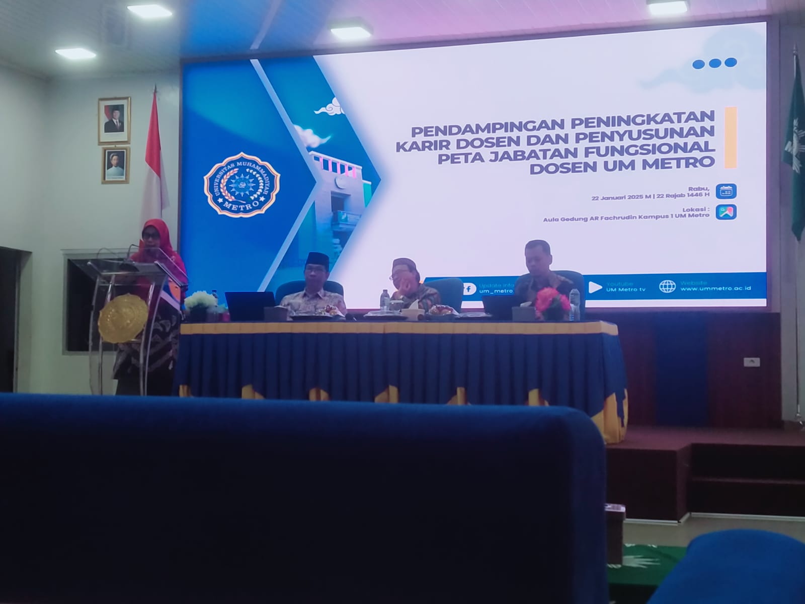 Metro, 22 Januari 2025 — Universitas Muhammadiyah Metro (UM Metro) menyelenggarakan kegiatan Pendampingan Peningkatan Karier Dosen dan Penyusunan Peta Jabatan Fungsional Dosen pada Rabu (22/1) bertempat di Aula Gedung AR Fachruddin. Kegiatan ini diikuti oleh dosen UM Metro yang belum tersertifikasi serta dosen pengusul Jabatan Akademik (JJA) Asisten Ahli dan Lektor.